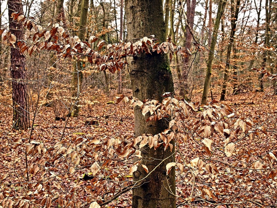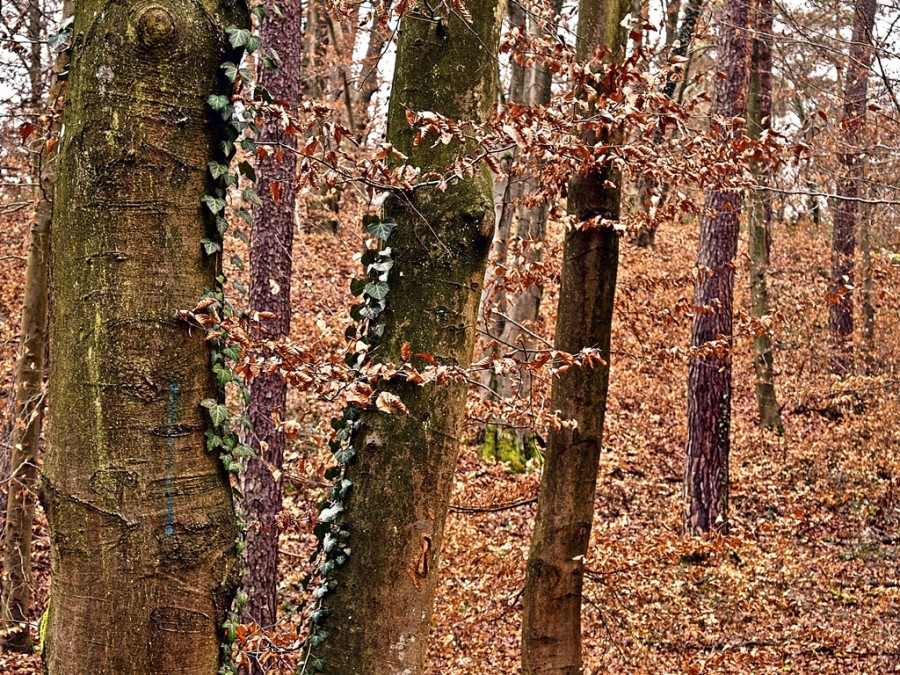 Besonders dann, wenn Nebelschwaden die Bäume umhüllen, zeigt der Wald sich in einer reizvollen Form, die nur im Winter oder Herbst so möglich ist. Da die meisten Bäume ihr Laub verloren haben, bieten die Baumskelette eine interessante Silhouette, die sehr schöne Fotos erlaubt. Strukturen , z.B. die Rinde, werden besonders deutlich, weil sie nicht mit Laub verborgen sind. Einzelne Blätter, die hartnäckig an den Ästen verharren, bieten sehr interessante Motive für Fotografien. Für Fotos bieten sich Strukturen wie Baumzusammen-stellungen oder auch Detailaufnahmen bis hin zu Makros an. Ein Blick in die Baumgipfel lohnt sich ebenfalls. Man muss damit leben, dass die Farbpalette eingegrenzt ist. Augen auf, die Natur bietet Farbklekse.